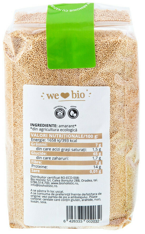 Amarantul este o pseudocereală având boabele foarte mici. Se gătește la fel ca și quinoa sau ca și orezul, pe post de garnitură. Amarantul provine din culturi ecologice certificate, fără pesticide.