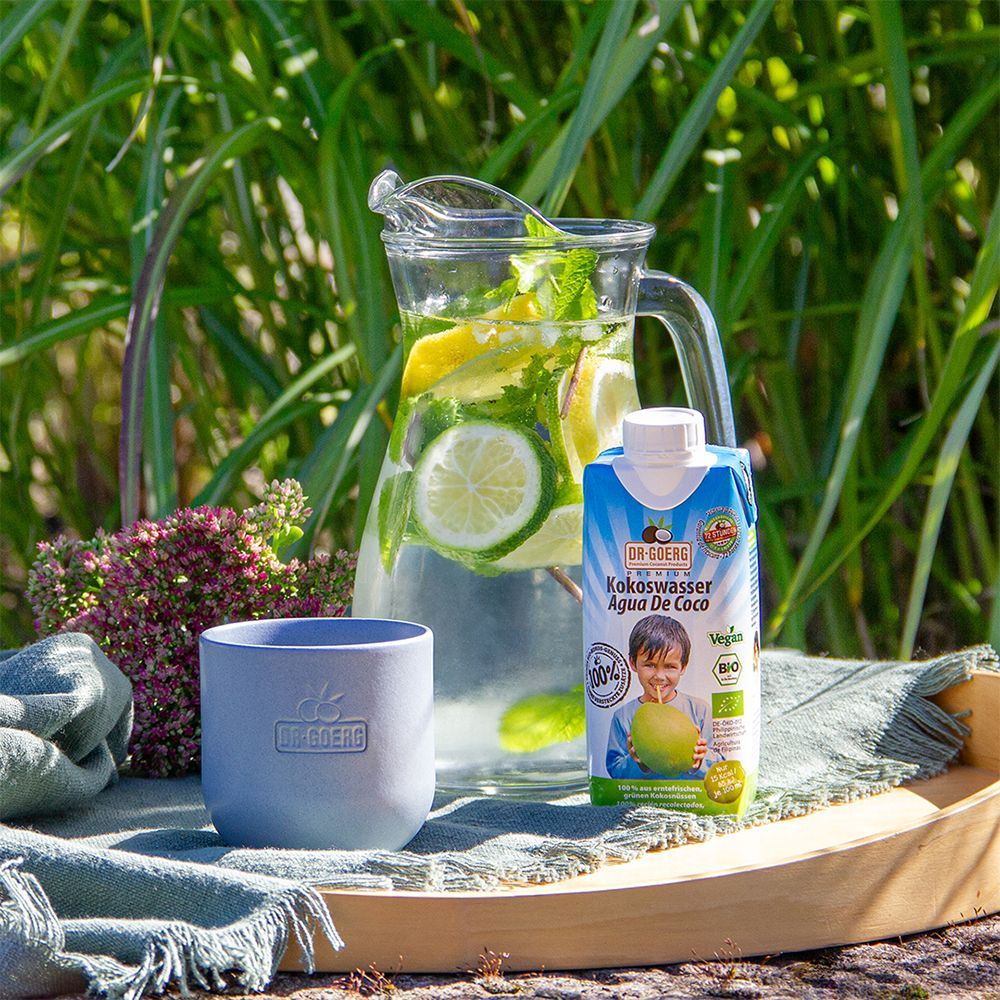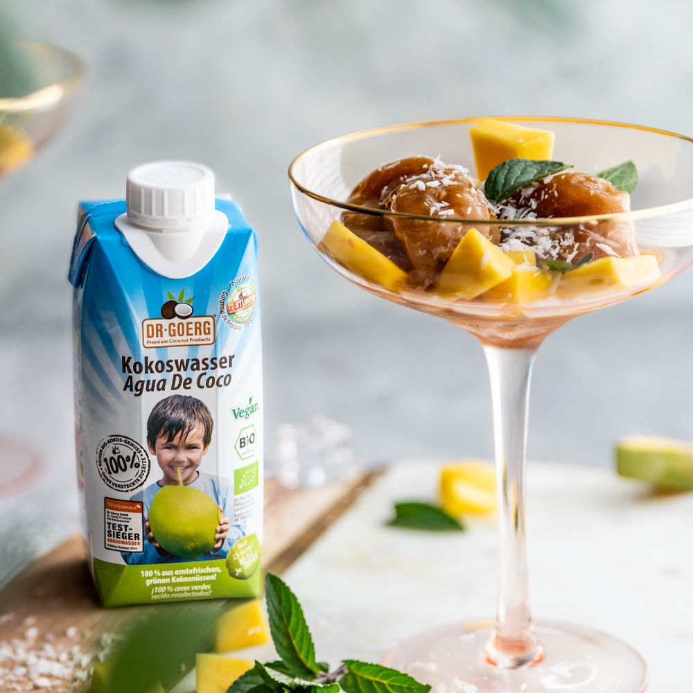 Apa de cocos Dr. Goerg este printre puținele ape de cocos bio de pe piață care nu conțin acid ascorbic pe post de conservant, având în compoziție 100% apă de cocos.