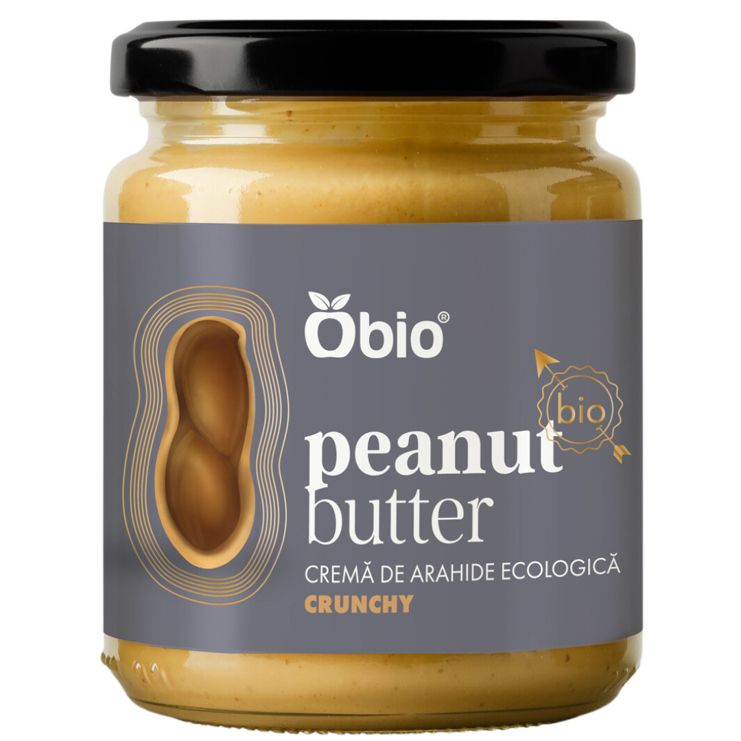 Crema de arahide crunchy este obținută 100% din arahide ecologice, fără niciun alt adaos, doar arahide. Textura este una foarte cremoasă și fină, cu bucăți de arahide pentru a-i da textura de crunchy, fiind foarte ușor de întins pe pâine, crackersi, etc.