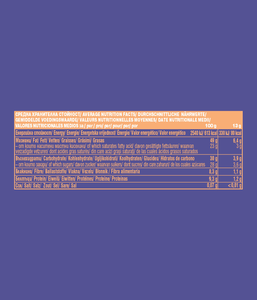 Ingrediente: zahăr de cocos, ALUNE de pădure prăjite* (27%), masă de cacao*, unt de cacao*, cremă de cocos*, ulei de cocos*, făină de cocos*, emulgator: lecitină din floarea-soarelui*.