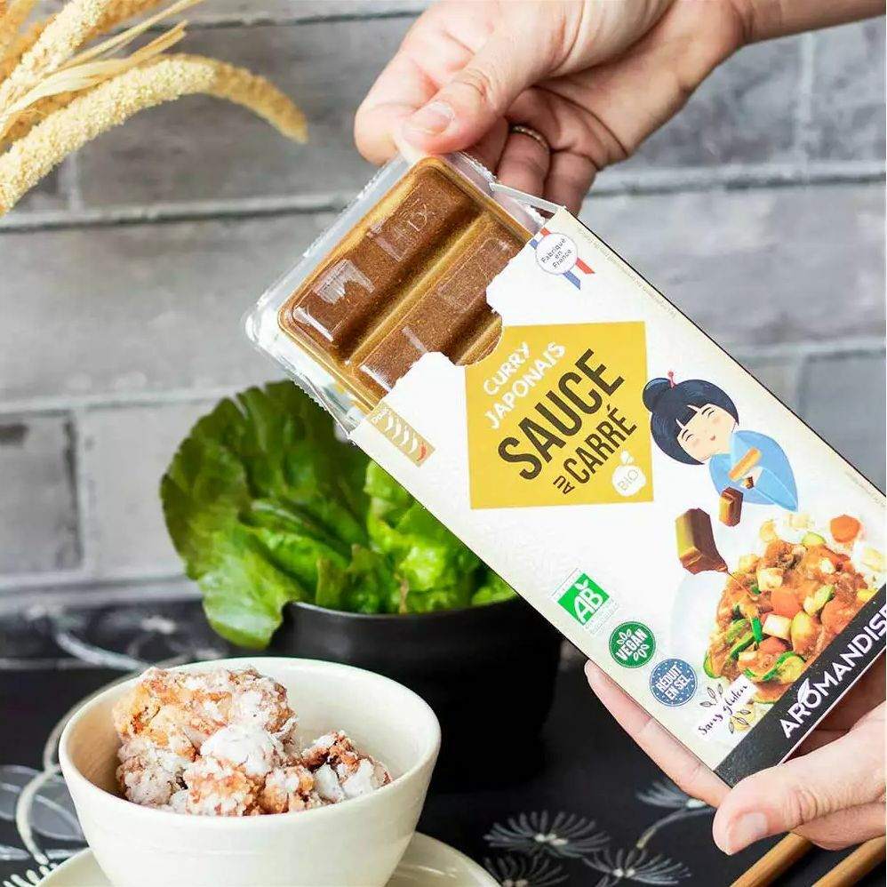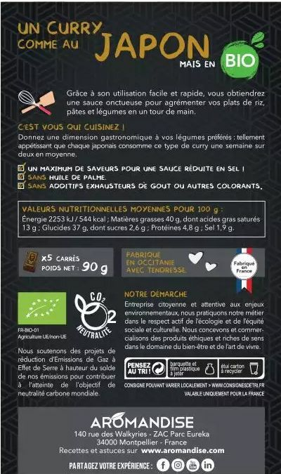 Ingrediente: amestec de condimente curry* 24% (turmeric*, ghimbir pudră*, usturoi*, sare, coriandru*, ceapă*, scorțișoară*, cuișoare*, piper negru*, chimen*, MUSTAR galben*, schinduf*, boia de ardei*, chimen*, busuioc*, fenicul*, oregano*, rozmarin*, cimbru*, salvie*), unt de shea*, făină de orez*, amidon de cartofi*, ulei de rapiță*, roșii pudră*.