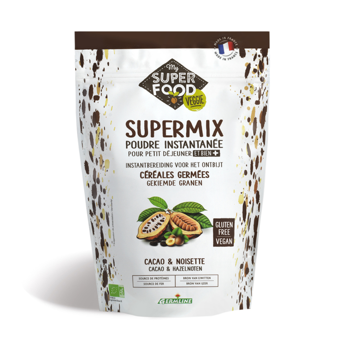Un supermix sub formă de pudră instant din cereale germinate cu alune de pădure și ciocolată, toate din agricultură ecologică.