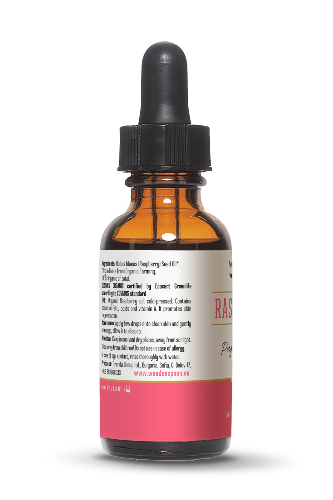 Ulei de zmeură organic, presat la rece. Conține acizi grași esențiali și vitamina A. Favorizează regenerarea pielii.