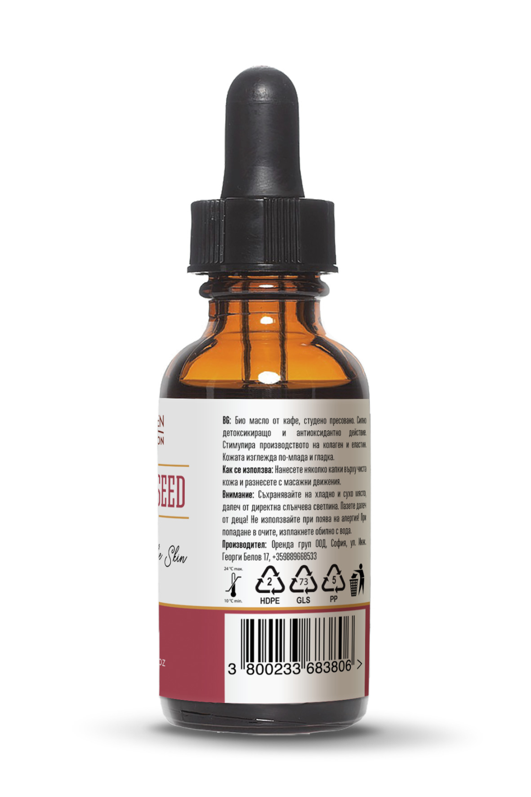 Ulei de cafea organic, presat la rece. Puternic antioxidant. Este perfect pentru detoxifierea pielii. Acest ulei detoxifică pielea, stimulează producția de colagen și elastină pentru o piele cu aspect mai tânăr.