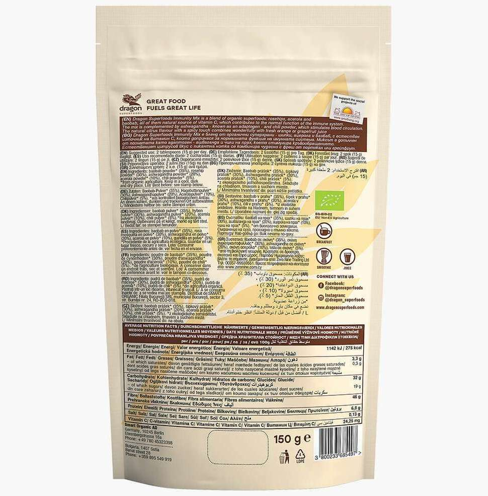 Ingrediente: pudră de baobab* 35%, pudră de măceșe* 30%, pudră de ashwagandha* 20%, pudră de acerola* 10%, pudră de chilli* 5%.