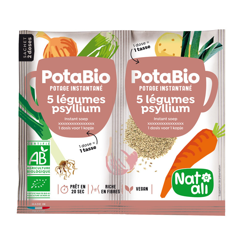 Supă instant cu 5 tipuri de legume și psyllium NAT-ALI oferă toate beneficiile plantelor și legumelor organice, fiind în același timp bogată în fibre în mod natural.