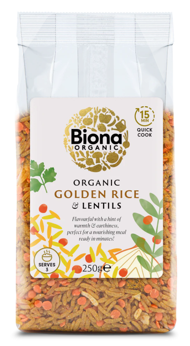 Orezul auriu și lintea bio Biona sunt o combinație de orez parfumat cu linte roșie bogată în proteine. Acest amestec care se gătește rapid este o sursă delicioasă de fibre. Infuzat cu un amestec bogat de condimente tradiționale, acest produs oferă o experiență culinară indiană autentică și aromată, care este atât convenabilă, cât și delicioasă.