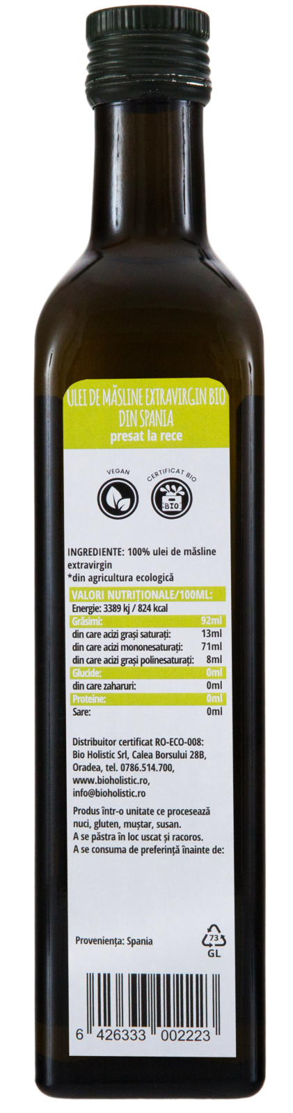 Uleiul de măsline bio extravirgin este obținut din prima presă, prin presarea la rece a măslinelor bio.
